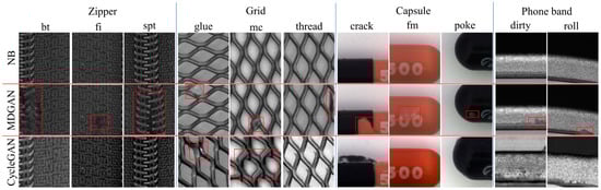 CycleGAN-based methods are leading the way in defect synthesis. To verify the advantages of MDGAN over other methods, CycleGANs were trained on the above datasets. To help CycleGAN retain the normal background, we added a L1 loss between the input and output to the original losses []. Some of results generated by CycleGAN and MDGAN based on the same backgrounds are shown in Figure 9. Despite the addition of the L1 loss, CycleGAN still modified the normal backgrounds, and it could convert the input normal images into defect images for the zipper-fi, zipper-sqt, zipper-spt, and grid-broken. Moreover, there were stretches and artifacts in the generated results of the capsule and phone band. This indicated that CycleGAN could only convert the source image into the most similar target image seen during the training for few-sample datasets, resulting in either a failed generation or loss of structures in the source image. In contrary, MDGAN generated realistic defect images for each category of input normal backgrounds and retained the original normal textures.
