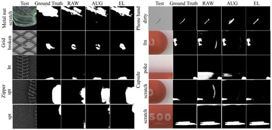 The mean testing results of each item are shown in Table 4, where higher values indicate a better detection performance. It can be seen that EL greatly improved the detection performance in contrast to AUG and RAW. The mean results were substantially improved in EL. Among the mean results of the various items, EL outperformed RAW and AUG, with an mIoU improvement up to 7.3% (UNet-capsule) and F1 up to 6.2% (sResNet-capsule). On the contrary, AUG reduced the overall detection results (zipper). Figure 10 shows a qualitative comparison of the segmentation results; the results of EL had less over-kill and escape versus RAW and AUG and were closer to the ground truths.