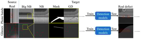 It can be seen from the above that MDGAN achieved defect image generation with complete retention of backgrounds. Therefore, we could try to employ the MDGAN-trained source dataset to perform defect synthesis on a target dataset and used only the synthetic target defect images to train models to detect real defects in the target dataset, thus achieving defect transfer and zero-shot detection of the target dataset.