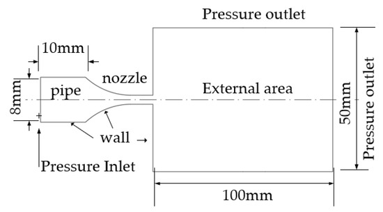 A CFD two-dimensional model was created, as shown in Figure 2. The abrasive mixture enters the nozzle from the pipe, and, after being accelerated in the nozzle, it jets into the external environment. The external medium is water in underwater operation, and the water pressure is 0.6 MPa. The inlet of the pipe is set as the boundary condition of the pressure inlet, the internal surfaces of the pipe and the nozzle as well as the nozzle end surface (ab) are set as the boundary conditions of the wall and boundaries ac, cd and bd of the external area are set for the pressure outlet. The pipe diameter is 8 mm, the pipe length is 10 mm, db = ac = 100 mm and ab = cd = 50 mm.