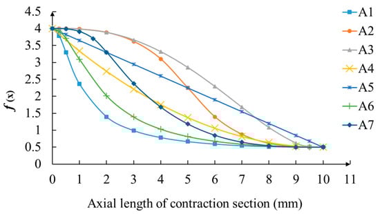 The geometric parameters of the widely used conical nozzle are a conical contraction section, an axial length of 10 mm, an outlet diameter of 1 mm and a focus-section axial length of 30 mm. The shapes of the contraction curves when the inlet dimeter of the nozzle was 8 mm, the outlet dimeter was 1 mm and the axial length of contraction section was 10 mm are shown in Figure 3.