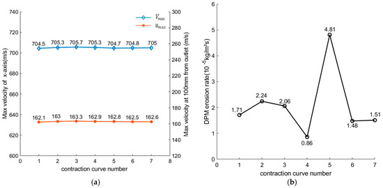 The contraction curve has little effect on the jet velocity, as shown in Figure 4a, indicating that changing the contraction curve cannot improve the cutting ability of the nozzle. However, in Figure 4b, has been changed a lot. The conical–straight curve, had the highest wear erosion rate, at ; with the streamline nozzle, the erosion rate could be decreased by 49.9–82.7% compared with that of the conical nozzle; and was the best curve.