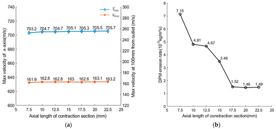 Effect of axial length of contraction section: (a) Effect of the axial length of contraction section on jet velocity; (b) Effect of the axial length of contraction section on .