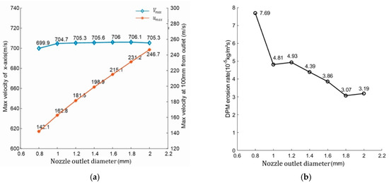 Effect of outlet diameter: (a) Effect of outlet diameter on jet velocity; (b) Effect of outlet diameter on .