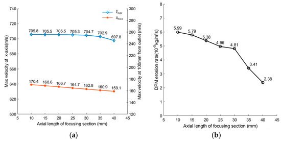 and only decreased slightly and decreased rapidly when the axial length of the focus section increased, as shown in Figure 7a,b, indicating that focus-section length has a low effect on cutting ability but a high effect on nozzle service life. More energy was lost in longer focus sections, resulting in a decrease in the peak velocity of the jet. However, with the lower jet velocity, the flow rate of abrasive particles was also reduced, thus reducing the erosion on the inner wall of the nozzle.