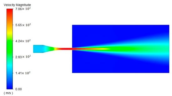 The optimal combination was not in the 49 sets of experiments, as listed in Table 5, so the optimal nozzle was simulated separately, as shown in Figure 8; , and nozzle performance excellence index = 1.441, which was the best result in all simulation tests, consistently with the theoretical analysis. The performance of this nozzle was 44.4% higher than that of the conical nozzle, the maximum velocity at the distance of 100 mm was 56% higher and the maximum erosion rate of the nozzle was 72% lower.