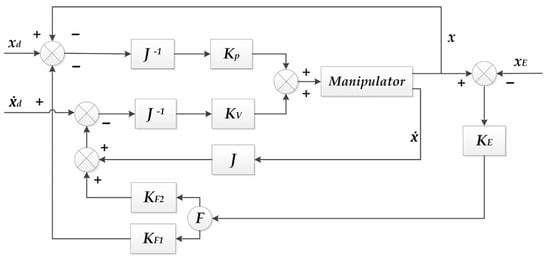 where “” is the end position error, “” is the desired position, and “” is the actual position. K, B, M are the stiffness, damping and inertia coefficient matrices, respectively, which are formed by the environment. Figure 1 shows one composition scheme of the resistance control system [35].