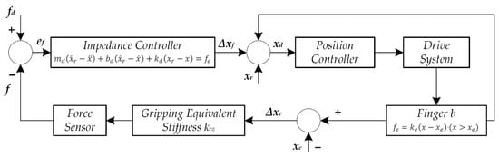Impedance control diagram for gripping force of the end-effector. In the formula: md, bd, kd, are the target inertia, damping and stiffness parameters; ke, xe, are environment stiffness and reference position; x is actual location; fe is contact force. In the picture: ∆xe is the clamping length, fd is the set force, xr is the reference position, ef is the actual force deviation, and xd is the control input.