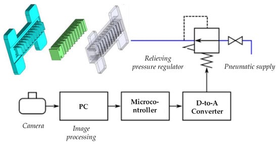 Currently, soft end-effectors are one of the most promising research directions in the field of soft robotics [55]. With its strong ability to operate in unstructured environments and broad development prospects, the soft end has made a large impact, and its inherent potential will enable it to provide better services to humans in a more diversified way [56,57]. Lv et al. [58]. designed the pneumatic driven soft robot actuator from a bionic perspective. The bending deformation of this modular actuator is achieved by controlling the magnitude and timing of the pressure inside the actuator cavity. Finally, they demonstrated the feasibility of bending the actuator. Wehner et al. [59]. controlled the flow of air in and out of the actuator by tuning the impedance limits to produce bending actuation. The finger actuator configuration system is shown in Figure 5. This configuration is used for uncontrolled, passive impedance control and visual servo feedback control methods. For the uncontrolled and passive impedance control methods, the camera and PC are used for data acquisition only.