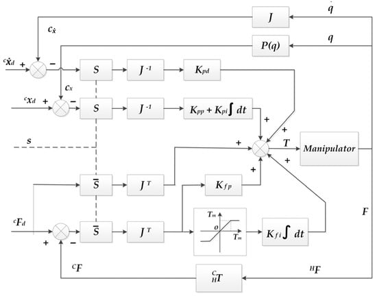 Mason first proposes the concept of simultaneous non-contradictory force and position control and the idea of joint suppleness in 1979 [70]. His approach is to control the force and position independently for different joints of the robots according to specific task requirements, which has some limitations. M.H. Raibert and J.J. Craig [71] conducted an important experiment in 1981 on hybrid position and force control of robotic manipulators. They assign forces and positions in any direction in the workspace to individual joint controllers utilizing Jacobi matrices and achieved good results. Later, this controller is called an “R-C” controller [72].