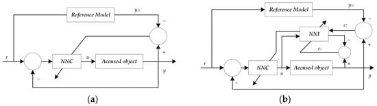 Model-referenced adaptive control of neural networks is used as an example [109]. The direct adaptive control method is shown in Figure 9a. The purpose of the control system is to maintain the difference between the controlled object output and the reference model output “”. However, since the backpropagation of the neural network controller (NNC) requires a known mathematical model of the controlled object when the system model is unknown or partially unknown, the learning and correction of the NNC is more difficult to perform and is not suitable for controlling uncertain objects. The indirect adaptive control method is shown in Figure 9b. When the mathematical representation of the controlled object is not clear, a neural network identifier (NNI) needs to be designed to identify the controlled object. Then, it learns and corrects online according to the recognition error “”, feeds the recognition result to the NNC, and provides backpropagation of the control error “”.