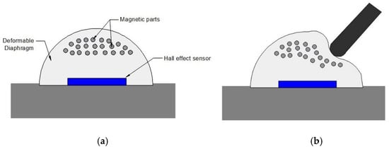 Depiction of the basic working principle of a tactile sensor. (a) A magnetic sensor using a Hall effect sensing element inside a deformable diaphragm embedded with small magnetic parts. (b) When contact is made, the diaphragm deforms, and the magnetic field changes.