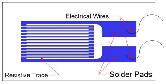When it comes to the conductive component, a wide variety of materials can be used. Strain gauges (Figure 5) fit precisely in the previous given description. Strain gauges are sensors, the measured electrical resistance of which differs with strain variations. There are many options available online or in shops, but strain gauges can also be easily fabricated. In [46], the fabrication of a strain gauge from elastomer cast and conductive traces (cPDMS) for a sensor skin is presented. A strain gauge was used in [34] in an automated sewing machine in order to control the tension developed on the fabric. Meanwhile, in [47], strain gauges were used to sense whether a fabric ply was grasped from the gripper, even calculating the number of caught plies. Other uses of strain gauges in fabric handling are presented in [23,48,49].