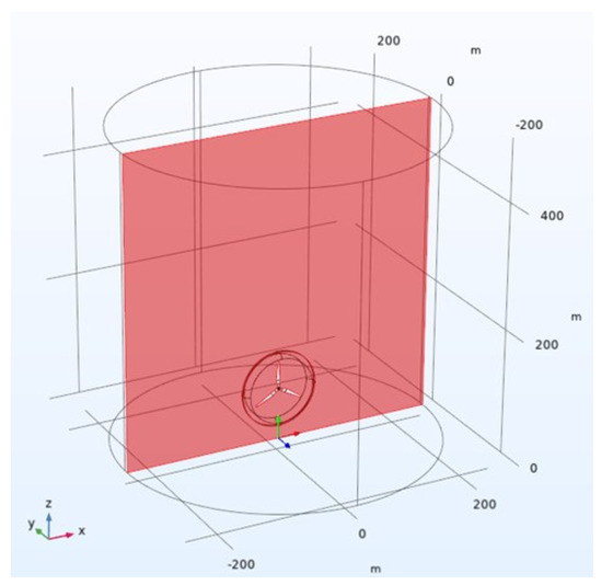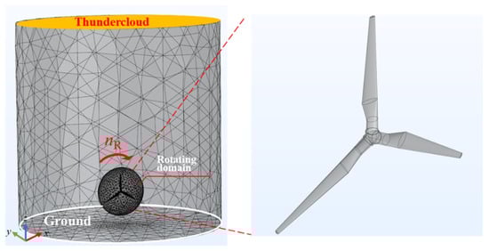 A 3D rotating WT model was established using the finite element software COMSOL Multiphysics, and the geometric model is shown in Figure 1. Since 90% of CG lightning in nature has negative polarity, E-field strength of the thundercloud was set to −40 kV/m for this paper. The WT model was established according to the actual operating WT’s geometry, and since the blade tip is a metal structure, the rotating impeller has a lightning shielding effect on the WT tower under the thundercloud. Therefore, the role of the tower was ignored during modeling, and only the impeller structure of the WT was established. According to the geometric parameters of a 2.5 MW WT, a 3D model of a WT was established in the coordinate origin. The hub height of the WT was set to 80 m from the ground, while the blade length was 50 m. Moreover, the blade tip was set as aluminum, and its radius of curvature was 10 cm. The computational solution boundary should be much larger than the WT model size so as to avoid the influence of scale effect. At the same time, the computational overhead caused by a large computational domain should be considered, so the computational solution area was set to 500 m in diameter and the height of the thundercloud was set to 1000 m.
