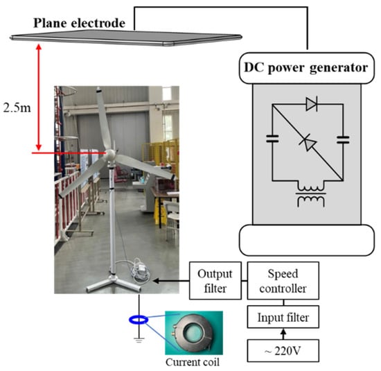 To verify the validity of the ion flow calculation of the rotating wind turbine, a long gap corona discharge experiment platform of a scaled rotating WT was designed, as shown in Figure 2. A plate electrode with size of 3 m × 2 m was designed to simulate the thundercloud-induced E-field. The tower of the WT had a height of 1.8 m, while the blades were 1.05 m. The blade tips were made of aluminum and grounded through the down-conductor. By hanging the plate electrode with high DC voltage at a height of 2.5 m from the nacelle and by measuring the corona current flowing through the grounding line, the quantity of space charge near the blade tip was obtained. The current coil had a frequency range from 10 kHz to 30 Mhz, which satisfied the requirement of corona current measurement. To prevent the plate electrode from generating corona discharge that interfered with the measurement results, the edges of electrode were rounded. Moreover, to eliminate the high frequency interferences generated by the switch devices in the speed controller, input and output filters were employed.