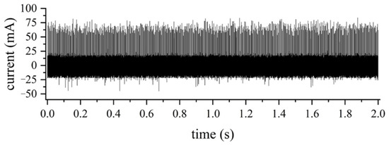 A DC voltage of −50 kV was applied to the plate electrode. A continuous and repetitive pulse discharge pattern of corona was generated when the blade remained static under the HV electrode, as shown in Figure 3.