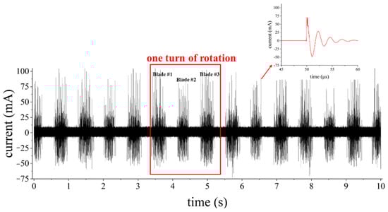However, every time when the blade tip rotated to the area below the HV electrode, the corona pulse discharge formed as the E-field on blade tip got stronger than the corona initiation field, thus forming a periodic discharge pattern. Moreover, the periodic sound of corona discharge was audible as the WT rotated. The measured periodic corona discharge signals from the rotating blades were obtained when the linear velocity of the blade tip was controlled at 3 m/s, as shown in Figure 4. As indicated in Figure 4, the corona discharge at the blade tip during the rotation of the WT was characterized by periodic clusters of discharge pulses. Every 3 pulse clusters represented one turn of rotation of the impeller, and the total corona discharge Qr for one rotation of the WT can be characterized by integrating 3 consecutive pulse clusters. Considering the symmetry of the three blades, the corona charge at the blade tip during the rotation of a single blade from a 0-degree to a 60-degree angle, with respect to the axis of the tower, was Qr/6.