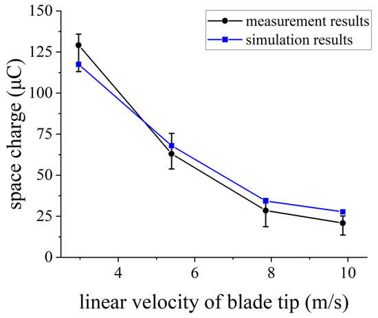 As can be seen from Figure 5, the simulation results were in agreement with the measurement results. However, in the case of larger linear velocity of the blade tip, the measured results were slightly lower than the simulated results because the corona space charge is difficult to fully flow into the grounding line while the rotational speed increases.