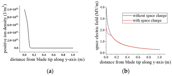 Distortionary effect of space charge on the electric field near the blade tip: (a) positive ions density, (b) electric field near static blade tip.