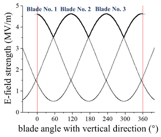 Without the influence of space charge, the E-field strength of the blade tip shows a periodic variation of rotation angle [18], as shown in Figure 7. The solid line in the figure shows the actual E-field of the blade tip after considering the shielding effect between the blades.