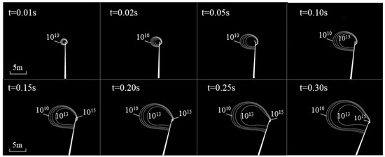 In the process of blade rotation from 0 degrees, the contour shape of a charged particle changes from circle-like to ellipse-like, dragged by the blade tip with the increasing rotation angle, as shown in Figure 9. The charged particle density decreases rapidly along the front side of the blade rotation, while a dense area is shown along the back side of the blade rotation as a stripe-like distribution.