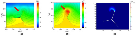The space potential near the rotating WT is also changed by the influence of the space charge distribution, as shown in Figure 10b by the red arrow. Due to the influence of the thundercloud-induced E-field and the rotation effect, positive particles accumulate at the back side of the blade rotation, which causes a positive space potential region. Moreover, the ionization will be more active in this area, resulting in a high E-field area, as shown in Figure 10c.