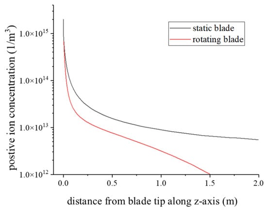 According to Figure 11, compared with the static case, the rotating blade decreases the number density of positive ions, which are already 1 order of magnitude lower, at 1.5 m, than the static case. Due to the reduction in charged particle density, the shielding effect of space charge near the rotating blade is weakened and the corona discharge is more easily initiated on the WT blade tip.