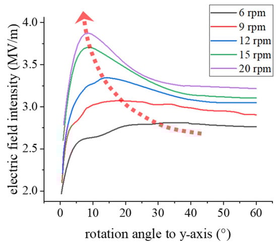 In addition, the rotation angle of the E-field maximum at the blade tip (marked by the red arrow in Figure 12) appears varied at different rotational speeds. The rotation angle of the E-field maximum decreases from 35 degrees to 8.6 degrees as the rotational speed increases from 6 rpm to 20 rpm.
