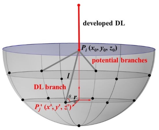 The lightning leader is usually a branching development, with multiple discharge branches forming a structure similar to tree-like branches. The potential development point of a branch leader was determined based on the dielectric breakdown model [20]. As shown in Figure 13, the developed leader is represented by a solid red line, while the potential leader is represented by a gray line. Supposing the downward leader to develop to the point Pi (x0, y0, z0), the next potential development points of the branch leaders were distributed on the hemisphere with Pi as the center of the sphere and the step length (taken as 10 m) as the radius, represented by black dots in Figure 13. Assuming that the angle between the potential branch leader and the vertical was less than 60 degrees, for calculation purposes, 25 developing points were uniformly dispersed on the sphere surface.