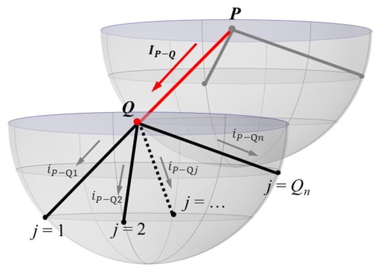 Assuming that the channel impedances of the lightning branches remain unchanged, the lightning current Ip is considered to shunt in the branches [23], that is, the lightning current injected into a branch development point is proportional to the potential difference and is distributed among the branches developed from that point. The charge densities of the branches developed from point Q were calculated by Equation (8):