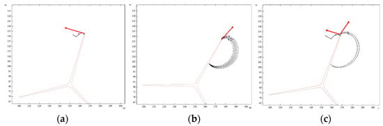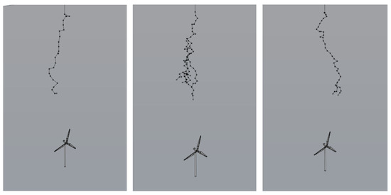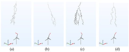 To obtain adequate results of the upward leader’s initiation and further explore the influence characteristics of the stochastic DL and blade rotation, the numerical calculation on the initiation process of the upward leader for the rotating WT was repeated 100 times. Natural lightning has random branching characteristics, so each time the random process of the lightning DL was calculated, a different lightning profile was obtained. However, under the influences of the thundercloud-induced E-field and the random downward leader, the initiation direction of the upward leader from the blade tip has certain statistical characteristics. Typical cases of upward leader initiation were obtained, as shown in Figure 17.
