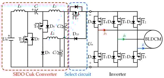 The proposed SIDO Cuk converter-driven BLDCM system is shown in Figure 1, and this system consists of the SIDO Cuk converter (in the red dashed box), selection circuit (in the blue dashed box), the inverter, and the BLDCM.