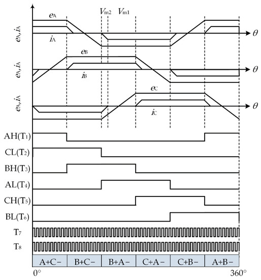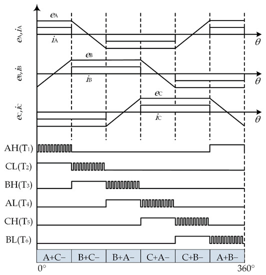 The ideal back electromotive forces (EMFs), ideal phase current, and ON-PWM modulation method of the BLDCM is shown in Figure 3, where θ is the electrical angle. There are six commutation cycles in a 360° electrical cycle. Observe the B phase as an example; when the B phase is the positive or negative conducting phase, the power switch T3 or T6 conducts in the first 60° electrical angles and chops in the last 60°. When the B phase is the overhanging phase, both T3 and T6 are turned off.
