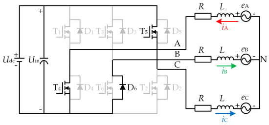 Observe the B + A − → C + A − commutation period as an example for analysis. During the commutation period, T3 is turned off, T5 is turned on, and T4 is modulated by PWM. Due to the presence of inductance in the motor windings, the commutation process cannot be completed instantaneously, and freewheeling through D6 is required, as shown in Figure 4. Ignoring the conduction voltage drop of the power switch and the freewheeling diode, the voltage equation of the three-phase winding terminal is obtained as