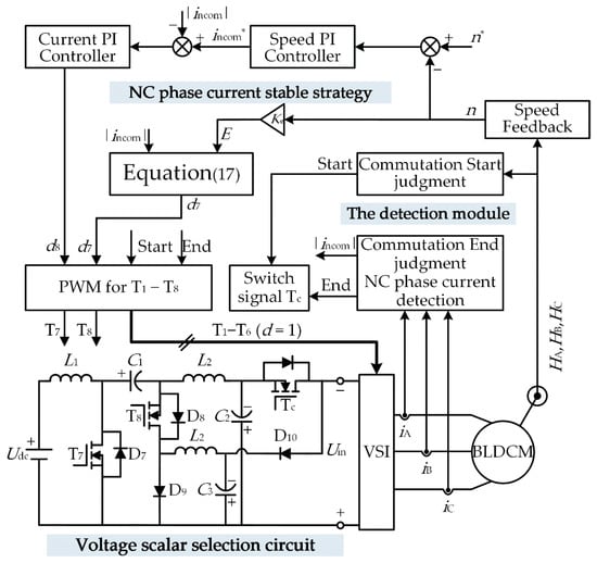 When the motor is running during the non-commutation period, Tc is turned off. The voltage scalar Vm1 is selected as the inverter input voltage, and the power switch T8 in the SIDO Cuk converter is adjusted by a speed and current PI controller to meet the motor speed regulation requirements. The detailed control method is shown in Figure 6. When the motor is running during the commutation period, Tc is turned on. The voltage scalar Vm2 is selected as the inverter input voltage, and the non-commutation current stabilization strategy is adopted to adjust the power switch T7 in the SIDO Cuk converter in order to meet the voltage demand during the commutation period. The inverter is only controlled by PAM mode, and it only performs the role of electronic commutation.