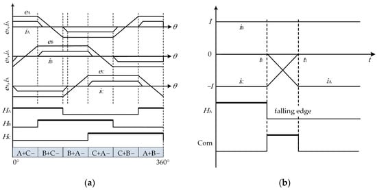 When it is detected that the outgoing current becomes zero during the commutation process, the commutation process is ended, the Tc is turned off, and the control strategy during the non-commutation period is entered. The corresponding relationship between back EMFs, phase current, and Hall signal is shown in Figure 7. The Hall signal’s (HA, HB, HC) and the commutation signal’s (Com) high levels are drawn by bold lines. As shown in Figure 7a, according to the transition edge (rising edge, falling edge) of the Hall signal (HA, HB, HC), a 360° electrical cycle can be divided into six commutation cycles. Observing the B + C − to B + A − commutation process of the Hall signal (HA) transition as an example, the detailed commutation process is shown in Figure 7b. At time t0, the transition edge signal (falling edge) of HA is detected, and the commutation process is started; during the period from t0 to t1, iA increases from 0 to −I, and iC decreases from −I to 0; at time t1, it is detected that iC becomes 0, and the commutation process is ended.
