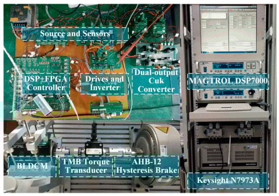 The experimental system was built based on DSP and FPGA. The BLDCM phase current is measured by CSM025A. The basic parameters of the experimental motor are listed in Table 1. The parameters of the SIDO Cuk converter are selected by the method in [19]. The values of capacitors C1−C3 are 1000μF, 670μF, and 1000μF, respectively, and the values of inductors L1−L3 both use 330μH. The DC voltage is provided by the Keysight N7973A DC power supply. The load is provided by the MAGTROL motor test system. The experimental results are recorded by a Yokogawa DLM4058 digital oscilloscope, and the inverter switching signals and SIDO Cuk converter drive signals T7 and T8 are obtained through the logic probe PBL100.