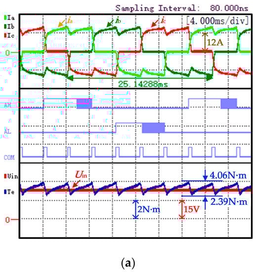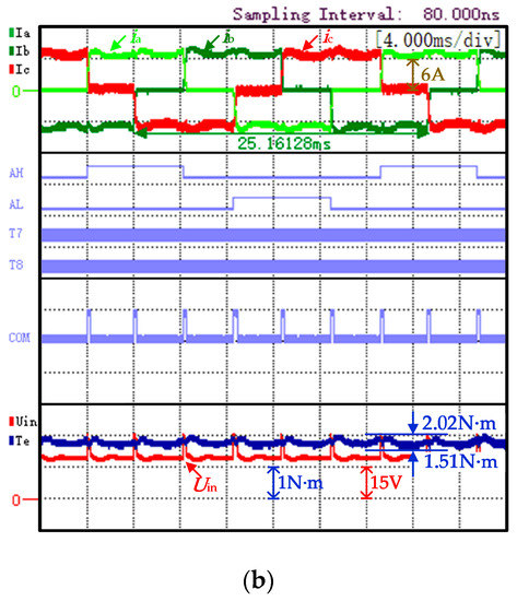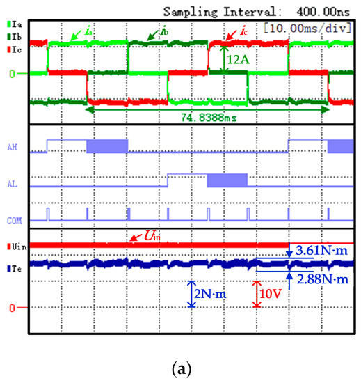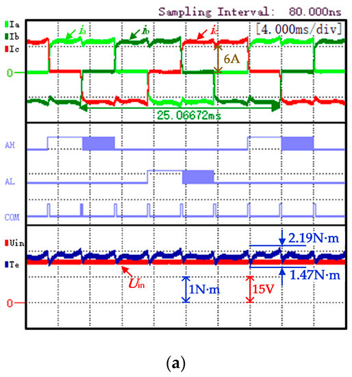 The traditional strategy experiment waveform, shown in Figure 10a, is represented from top to bottom as three phase currents (iA, iB, and iC), A-phase PWM signal (AH is the upper arm, AL is the bridge arm), the commutation signal "COM", the input voltage of the inverter (Uin), and electromagnetic torque (Te). The power supply voltage satisfies Udc = uN = 24 V; it can be observed that the non-commutated phase current has obvious ripples with KrT being 25.4%. The proposed strategy experiment waveform is shown in Figure 10b. At this time, the power supply voltage Udc = 22 V; it can be observed that the torque ripple is significantly reduced with KrT being 9.8%.