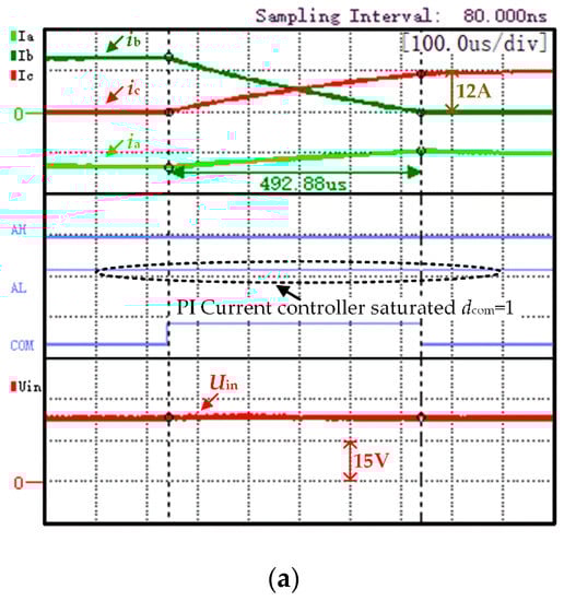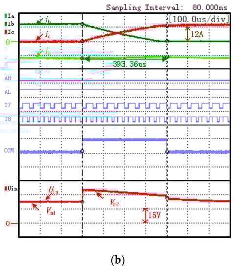 From the commutation period of the traditional strategy shown in Figure 11a, it can be observed that the power supply voltage of the system is constant, and the output of the current PI controller is saturated. At this time, dcom = 1, and the non-commutation phase current cannot be kept stable. Under the proposed strategy shown in Figure 11b, the inverter input voltage has two different values during the non-commutation period and the commutation period. During the non-commutation period, the voltage scalar Vm1 is selected to meet the motor speed regulation requirements. During the commutation period, the voltage scalar Vm2 is selected to meet the voltage required to keep the non-commutation current stable.