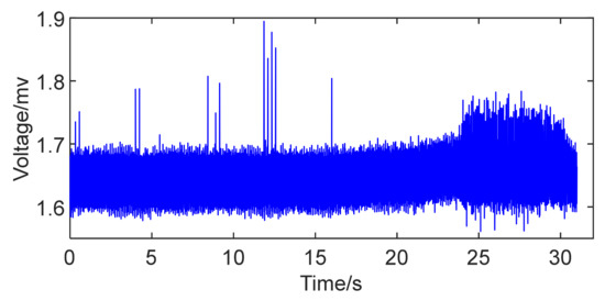 The original output voltage signal at measuring point #1 was obtained in Figure 2 at the rotating speed of 2500 rpm. Because of the noise signal in the collected data, it was necessary to carry out a low-pass filter processing on the original signal to filter out the high frequency noise. Then, the voltage signal could be converted into the pressure data through a linear transformation. In this paper, data sampling was performed at a sampling frequency of 5000 Hz. As to improve the computational efficiency, on the premise of ensuring signal with no distortion, the sampling time was changed to increase the time interval of the sequence. According to the Nyquist sampling theorem, the pressure signal data after the low-pass filtering was resampled to reach a sampling rate of 500 Hz. The sampling factor was chosen to be 10.