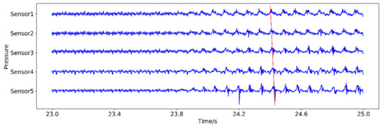 In the denoise procedure, wavelet decomposition and reconstruction technology are adopted in this article. Figure 3 shows the pressure data of each measuring point in time domain after resampling and denoising. It can be seen from the Figure 3 that under normal working conditions, the pressure signal of each measuring point was relatively stable. However, the pressure of each measuring point fluctuated greatly as the working state of the compressor approached the stall boundary. The stall wave propagated along the circumferential direction of the compressor, corresponding to the loss of stability in the dynamic system.