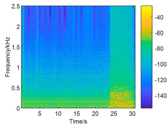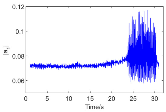 According to the pressure signals after resampling and denoising, the first-order spatial mode amplitude |a1| in the development of the rotating stall is shown in Figure 4. This method of data processing can effectively avoid the inaccurate recognition of the single or multiple measuring sensors only depending on pressure. It can be seen that the amplitude of the first-order spatial mode fluctuated sharply, corresponding to the large fluctuation of pressure in Figure 3. From the analysis on the frequency diagram of the amplitude of spatial mode calculated in Figure 5, it can be concluded that the moment with the characteristic frequency of the stall cell concentrated was consistent with the moment of the amplitude of the spatial mode in the large fluctuation. The time of entering stall was calculated to be at about 23.97 s. The variation of the first-order spatial modal amplitude accurately reflects the basic features of the dynamic system in the compressor from normal operating conditions to the rotating stall condition. In the stage of neural network modeling, the amplitude of the first-order spatial mode in time series will be employed to establish a system stability prediction model.