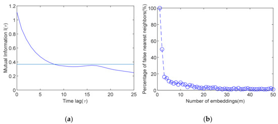 In the computation on delay time by the average mutual information function, the tendency of the correlation function with the delay time is indicated in Figure 6a. As the literature [16] pointed out, the minimum value of function I() indicates the maximum uncorrelated possibility of x(n) and x(n + ). The first minimum value of I() is chosen as the optimal delay time during phase space reconstruction. However, in practice, There may be not a local minimum in I(), but a monotonic decreasing function. Therefore, the selection of the parameter needs to be formulated in combination with another standard. In this solution, the value of which is lower than the value 1/e in the AMI function, is selected as the optimal delay time. Under this condition, the optimal delay time is obtained as 8 in the time series of spatial modal amplitude |a1| according to the average mutual information function in this research.