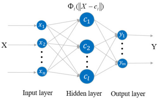 The radial basis function (RBF) neural network is a kind of feedforward neural network. The three-layer structure is generally contained, including an input layer, a hidden layer and an output layer [18]. The RBF neural network structure is shown in Figure 7, which represents an n-l-m structure network. This means that the network has n input variables, l hidden nodes, and m output variables. The transformation from the input space to the hidden layer is non-linear in the RBF network, and the transformation from the hidden layer to the output space is linear.