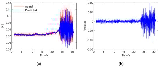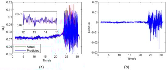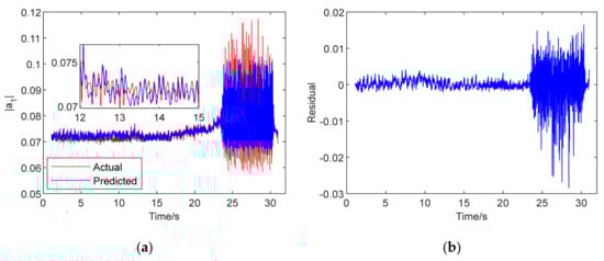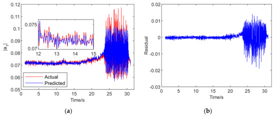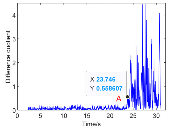 The results of the multi-step prediction are shown in Figure 14, indicating the prediction of the first-order spatial modal amplitude and the residual in the process. Due to the increase in the steps in the multi-step prediction, the residual was enlarged in modeling the system compared with the one-step prediction. The dynamic G-SampEn of spatial mode amplitude in multi-step prediction is shown in Figure 15, with a comparison to the actual value of the experiment. The parameter setting of the G-SampEn algorithm was the same as that of the single-step prediction in Section 4.1. In spite of the differences in numerical values, the tendency of variation was still consistent with the experiment data for the same mutation time. The principle of difference quotient was also introduced into the analysis on the dynamic G-SampEn of multi-step prediction to effectively identify the pre-stall moment. The computation result is revealed in Figure 16. The moment with a rapid increase in the difference quotient was regarded as the instability boundary of the system for the stall. The first peak of mutation, pointed to by mark A in the difference quotient, is considered to be the identification signal. This moment was recognized as 23.746 s. In the meantime, the time interval of 18 steps in the multi-step prediction model was 72 ms. Therefore, based on the Chaos–K-means–GD–RBF hybrid neural network multi-step model, the inception of the system stability can be distinguished about 296 ms (12.3 revolutions) ahead, with the identification strategy of the sample entropy algorithm.
