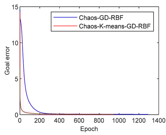 The contrast of variation on error reduction is pictured in Figure 11 between the Chaos–GD–RBF neural network model and the Chaos–K-means–GD–RBF hybrid neural network model during the training process. It can be seen that the reduction of error decreased more quickly in the Chaos–K-means–GD–RBF fusion model. Simultaneously, the cost of calculation was compared quantitatively. By extracting the average time of five steps in computation process, the time cost for determining three parameters in the Chaos–GD–RBF model was 32.8 s, and that of the Chaos–K-means–GD–RBF model was 20.43 s. In terms of calculation cost, an obvious advantage can be seen in the processing efficiency of the Chaos–K-means–GD–RBF model. From the analysis above, it can be concluded that the hybrid neural network model proposed in this paper exhibited excellent performances on the modeling of a nonlinear dynamic system with an accurate prediction. In a combination with the K-means algorithm and the GD algorithm, the calculation accuracy was improved in the hybrid neural network model based on phase space reconstruction. The computational efficiency was also promoted significantly, as compared with the two methods mentioned above.