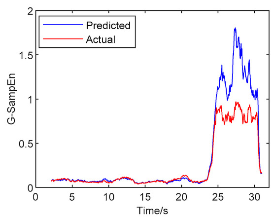 Figure 12 shows the curves of dynamic G-SampEn for the predicted model and the actual value of the first-order spatial mode amplitude. It can be seen from the figure that the tendency of variation was almost the same both for the prediction and actual value in the analysis of G-SampEn. As the system approached the boundary of instability, the magnitudes of sample entropy showed an obvious mutation with a rapid increase. With the occurrence of the rotating stall, the entropy of system was significantly greater than that under normal operating conditions. From the above analysis, it can be concluded that the developing process of the dynamic system showed obvious mutation phenomena at the unstable boundary, based on the G-SampEn analysis of the spatial mode. The developing trend of the prediction was consistent with the property of real data.