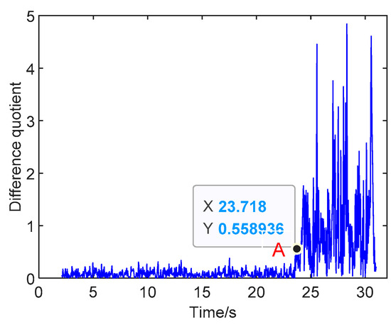 In order to accurately identify the stall precursor, an identification strategy with difference quotient criterion is introduced this paper based on the dynamic G-SampEn of prediction. According to the amplitudes A(k) of dynamic G-SampEn, the difference quotient is calculated by , where represents the sliding step time, and reflects the dynamic rate on the variation of G-SampEn value with respect to the time. As shown in Figure 13, the disturbance of the difference quotient emerged obviously when the rotating stall was about to happen. Moreover, the rapid increase in the difference quotient can be regarded as a significant feature of the system approaching instability. The moment with the rapid increase in the difference quotient value corresponded to the moment of the dynamic G-SampEn happening with a mutation. This exact time was judged as an identification signal for the pre-stall time with the difference quotient reaching the first peak, exceeding the threshold, as pointed out by A in Figure 13. The pre-stall time of recognition was marked as 23.718 s, which was ahead of stall time 23.97 s. In addition, the time interval of each step in the single-step prediction model was 4 ms. Therefore, an early warning of the stall inception can be given at about 256 ms (10.7 revolutions) in advance, based on the Chaos–K-means–GD–RBF neural network single-step model with an identification strategy of the sample entropy algorithm.