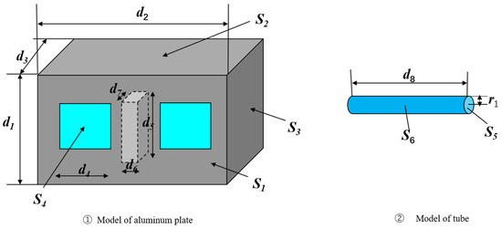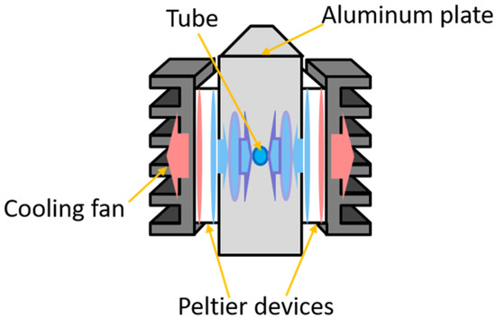 Models of the single aluminum plate and tube are presented in Figure 2, based on the physical laws of heat transfer, such as Newton’s law of cooling, Fourier’s law concerning thermal conduction, and Joule heat. As mentioned above, Newton’s Law of cooling states that the rate of change of temperature is proportional to the difference between the temperature of the object and that of the surrounding environment. Fourier’s law is known as the rate of heat conduction through a plane layer, and is proportional to the temperature gradient across the layer and the heat transfer area of the layer. Joule heating is the physical effect through which the current passing through an electrical conductor produces thermal energy. The thermoelectric effect is the actuated thermal process by Peltier devices, as shown in Figure 3.