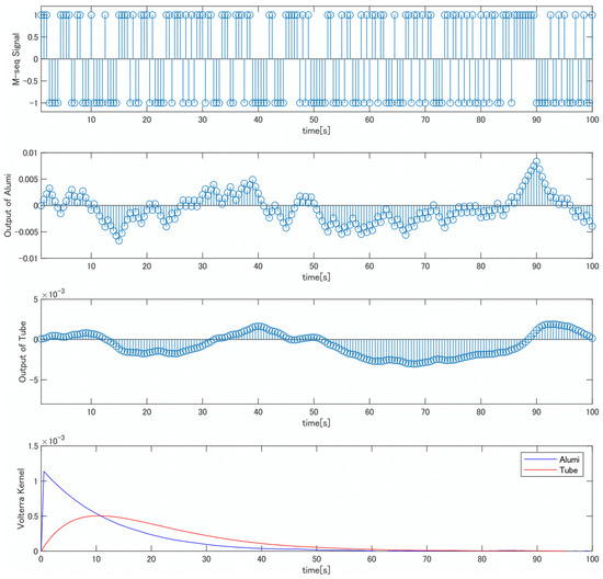 According to Equations (10) and (11), the kernel identification of the aluminum plate and tube are computed by the sensor measurement as the output and M-seq as the input signal, respectively, as shown in Figure 4.